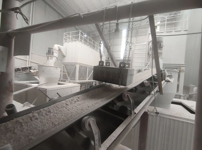 隨后礦石將被輸送入一級鄂式破碎機破碎至150毫米以下,同時均勻落在底部皮帶輸送機上。現場工作人員負責檢查篩選出皮帶上的低品位礦石,以有效提高礦石的白度與品位。經過挑選后再次進入二級錘式破碎機,進一步細碎。