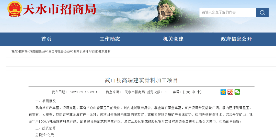 據中國砂石協會獲悉,近日,甘肅省天水市招商局公布了清水縣花崗巖建筑骨料生產項目和武山縣高端建筑骨料加工項目進展情況,兩個項目合計投資23億元,每年共計生產加工4000萬噸建筑骨料。資源儲量共計約為11.2億噸!目前兩個項目都已完成項目建議書。