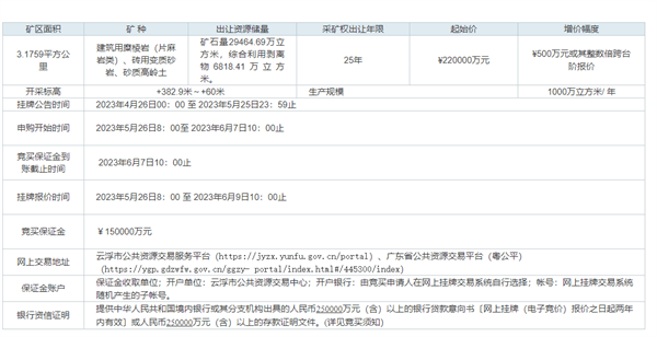 需要關注的是,當地政府為解決礦區日常生產生活、生產經營車輛增多、通行壓力大以及確保石料運輸過程沿線居民出行安全問題,并為今后實現礦地統籌創造條件,須由采礦權競得人負責出資建設礦區道路,估算總投資40000萬元。競得人須在簽訂《非油氣采礦權出讓合同》后,在2023年9月30日前支付第一期款項人民幣20000萬元到云浮市云城區財政局指定銀行賬戶,第二期在2023年11月30日前繳納剩余款項人民幣20000萬元,以支持地方政府進行基礎設施建設。