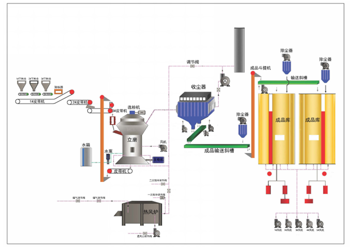 堆放著的礦渣由鏟車(chē)取料、喂料,通過(guò)皮帶機(jī)進(jìn)行輸送。在輸送過(guò)程中,礦渣原料先后經(jīng)由除鐵器和振動(dòng)篩得到除鐵和篩分,然后通過(guò)稱(chēng)重設(shè)備倉(cāng)、提升機(jī)進(jìn)入礦渣立磨機(jī)進(jìn)行粉磨。粉磨后的礦渣借助熱風(fēng)爐提供的熱風(fēng),通過(guò)選粉機(jī)進(jìn)行選粉,同時(shí)得到烘干。符合細(xì)度要求的礦渣粉較后被輸送到收塵器收集、盛放后,由空氣輸送斜槽、提升機(jī)進(jìn)入成品庫(kù)中儲(chǔ)存。